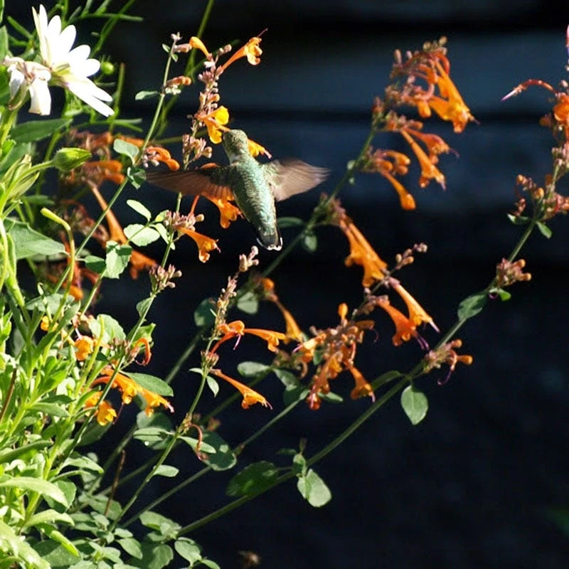 Agastache aurantiaca ‘Apricot Sprite’ (Hummingbird Mint) is a hummingbird favorite with its apricot-orange flowers that bloom profusely during the heat of mid-to-late summer. An outstanding, low-care perennial, this Agastache blooms for several months and does best with occasional deep watering and very little fertilizer once established. Both the flowers and foliage have an intense mint scent. Bred by Jelitto Seed, Europe’s leading perennial seed company. Likes low fertility and well-drained soil. You can grow Apricot Sprite Hyssop as an annual; it makes a wonderful potted plant that will attract hummingbirds. 15-18″ tall x 24″ wide.