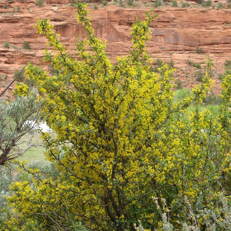 Ribes odoratum ‘Crandall’ (Clove Scented Currant) is a fast-growing heirloom fruiting shrub with fragrant bright-yellow mid-spring flowers followed by large edible blue-black currants. ‘Crandall’ has beautifully colored fall foliage too. Drought resistant/drought tolerant plant (xeric).