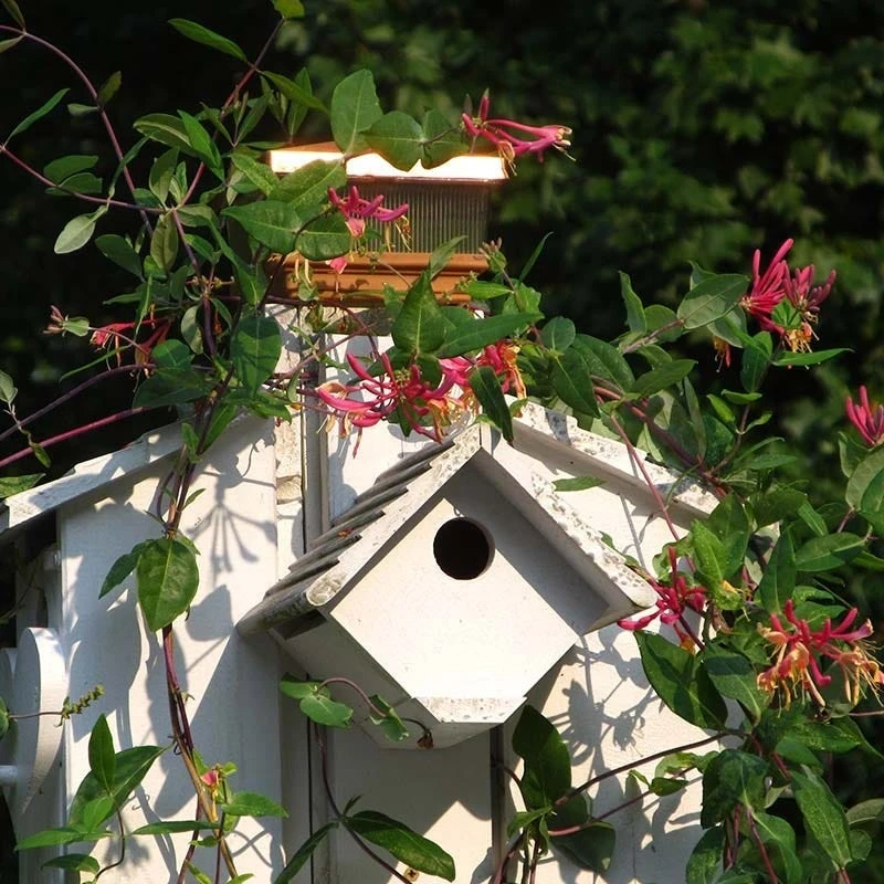 6-8′ x 5-10′ wide. Lonicera sempervirens ‘Major Wheeler’ (Honeysuckle Vine) puts on a hummingbird display unrivaled by any other Honeysuckle variety. Garden trials have demonstrated that this is the most profuse bloomer of its species. With its mass display of thin tubular, red-orange flowers from late spring through the end of summer and highly disease resistant foliage, ‘Major Wheeler’ Honeysuckle is a low care, high color addition to the landscape. Bring hummingbirds up close to your patio by training ‘Major Wheeler’ onto a nice trellis or pergola. A fast growing vine, use it to quickly cover unsightly fences. Partially evergreen in southern climates, deciduous in colder zones of the north. Because this blooms on old and new wood, there is no need to prune other than to shape the vine once blooms have passed. 2010 Plant of the Year.